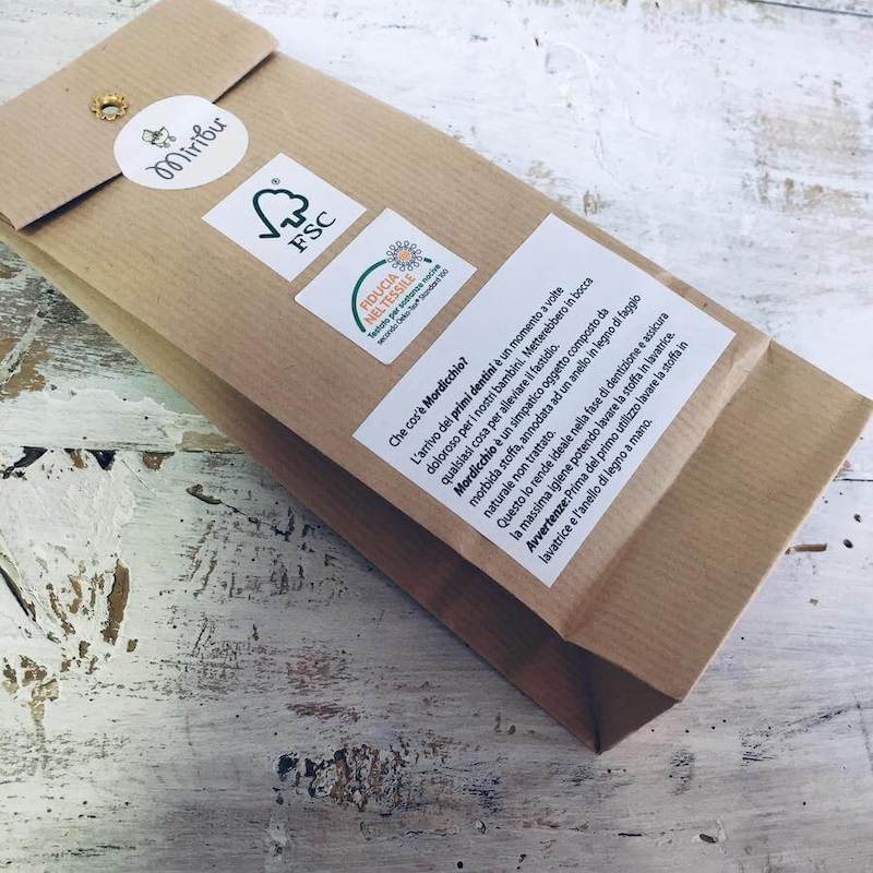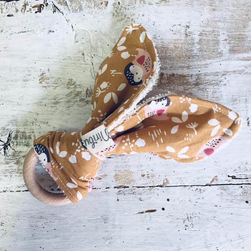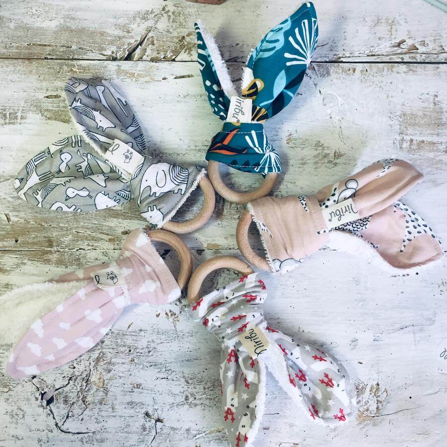 Questo lo rende ideale nella fase di dentizione e assicura la massima igiene, la stoffa è lavabile in lavatrice e l’anello di legno a mano.
