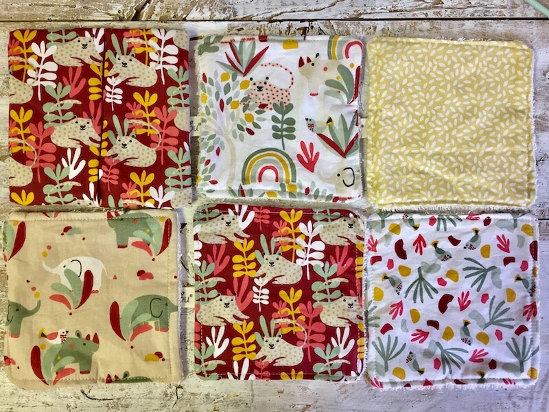 L’articolo è composto da una pochette in cotone contenente 5 Quadrotti assortiti, fronte cotone, retro in morbida spugna.